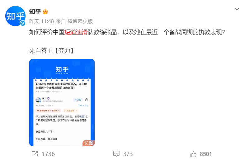 而当聊到本届争议颇大的中国短道速滑队教练张晶时,知友们则从两个完全不同的角度形成激烈的交锋: