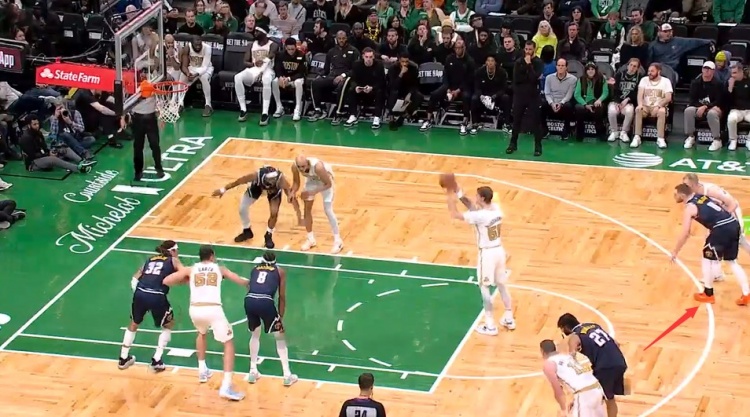 末节剩13.7秒,布劳恩在对手罚球时提前进入三分线,违例未吹。↓